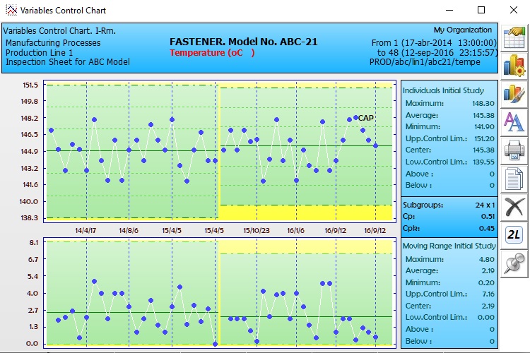 Moving Averages and Ranges. Any of these can be obtained as an initial study or with pre-established limits.